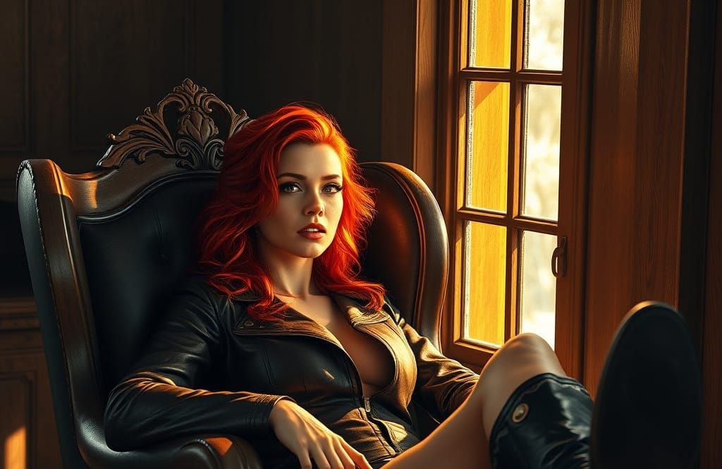 This image shows a captivating, oil-painted portrait of a red-haired siren, exuding quiet confidence and mischief. She reclines in a worn, wooden chair, surrounded by warm, golden light and deep shadows, inviting the viewer to step into her intimate scene.