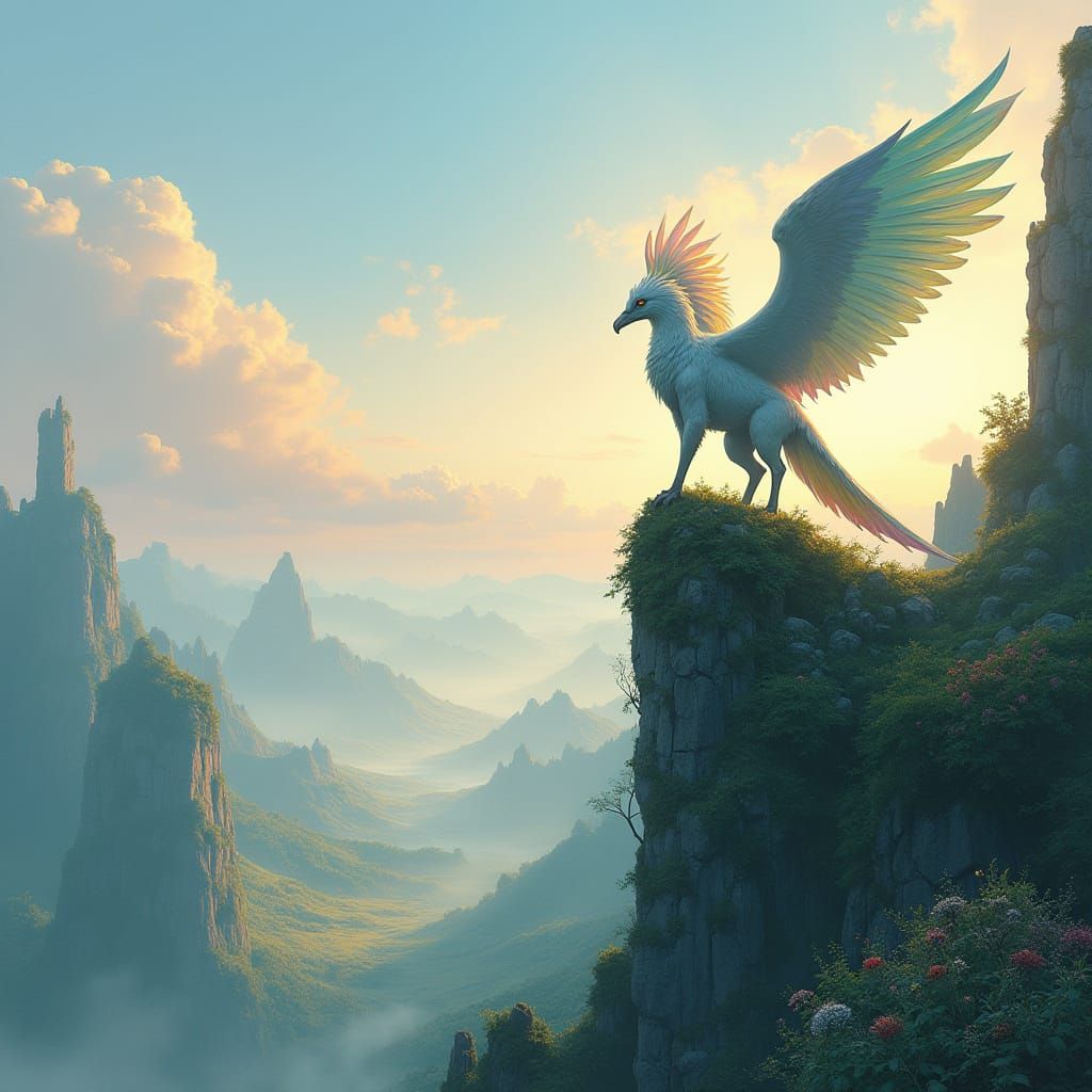 This image shows a griffin with iridescent feathers sitting on ancient ruins. A misty valley stretches below, featuring ethereal flora under a pastel dawn sky. The art style is a detailed fantasy illustration.