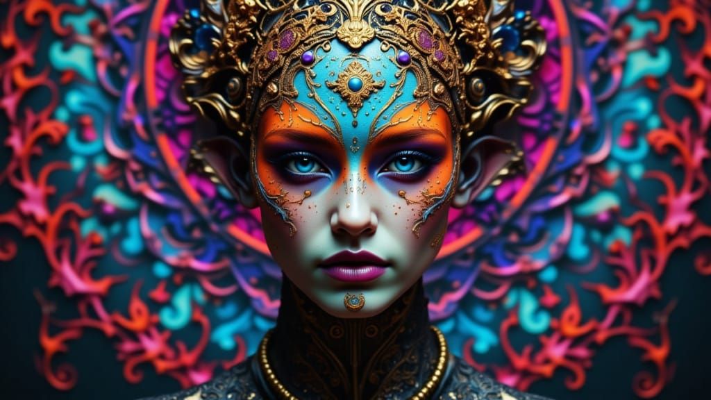 This 8k concept art features a detailed head and shoulders portrait of an alien mandala. Dynamic lighting and triadic colors create a visually striking image with a splash art aesthetic.