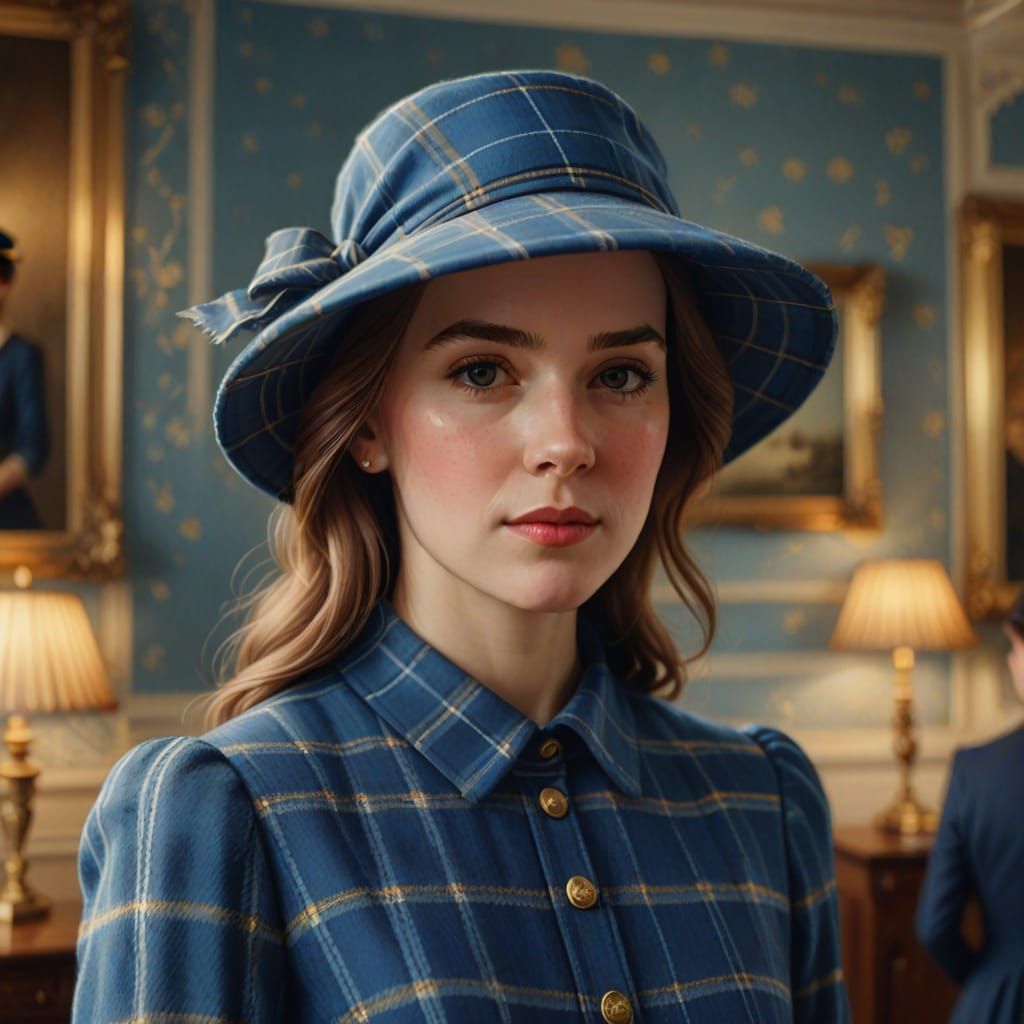 This image shows a Scottish woman in traditional attire, including a blue tartan dress and hat. The portrait features soft, warm lighting, a blurred background, and subtle textures.