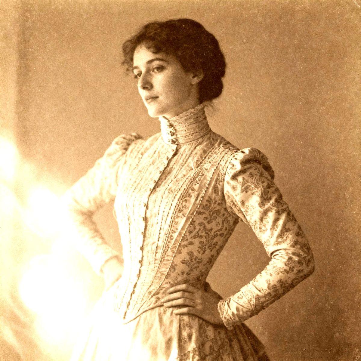 A realistic portrayal of a woman in elegant Victorian attire, captured in a warm, sepia-toned photograph with soft, ethereal lighting and meticulous detail.