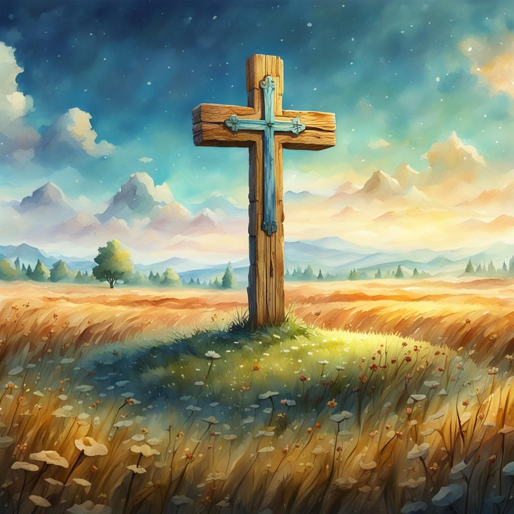 A striking picture of a wooden cross in an open field. This watercolor painting captures a whimsical style with intricate detail, deep color, and complementary colors.