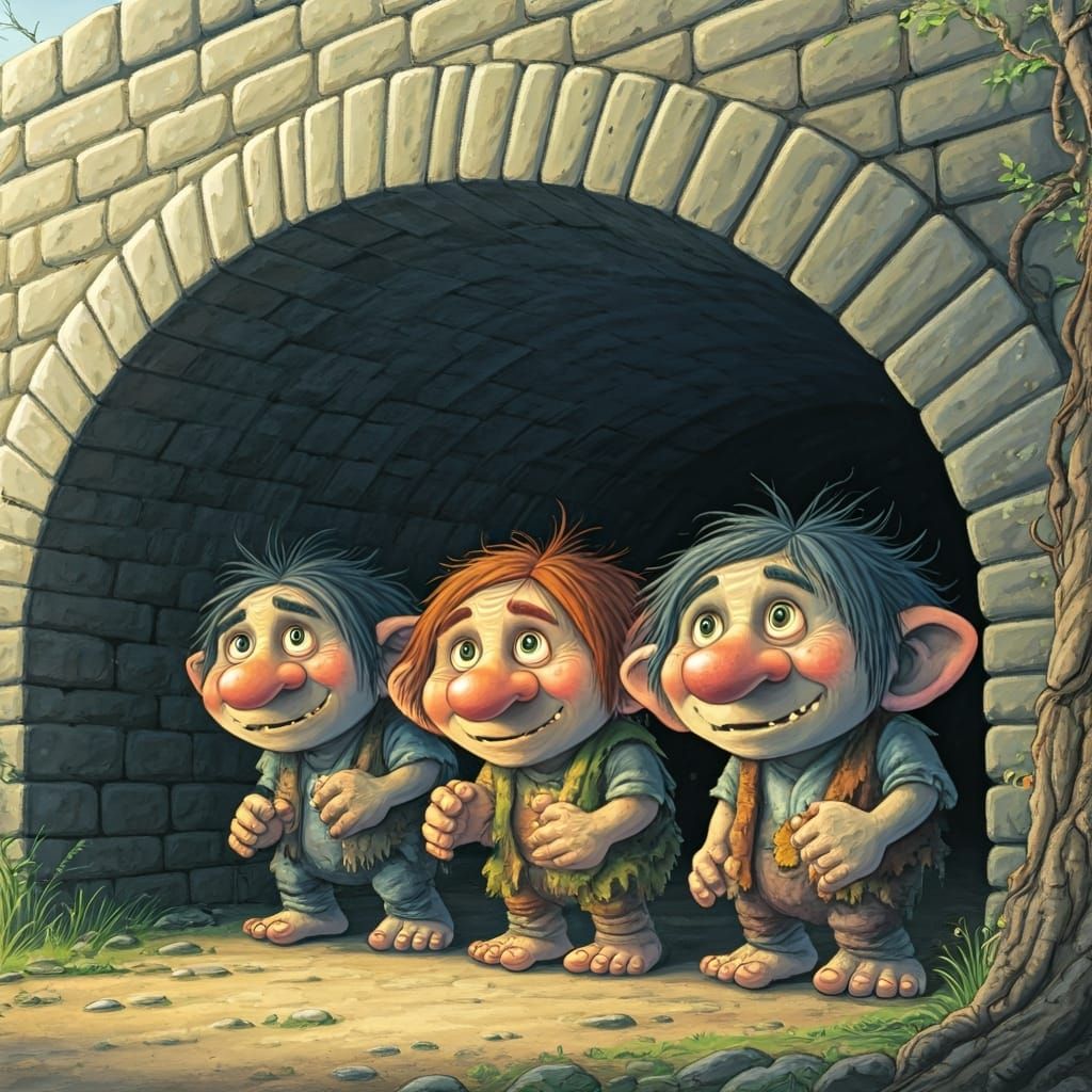 This image shows three trolls concealed beneath an old stone bridge. The illustration evokes classic children's book art with its detailed depiction of the trolls and their hiding place.