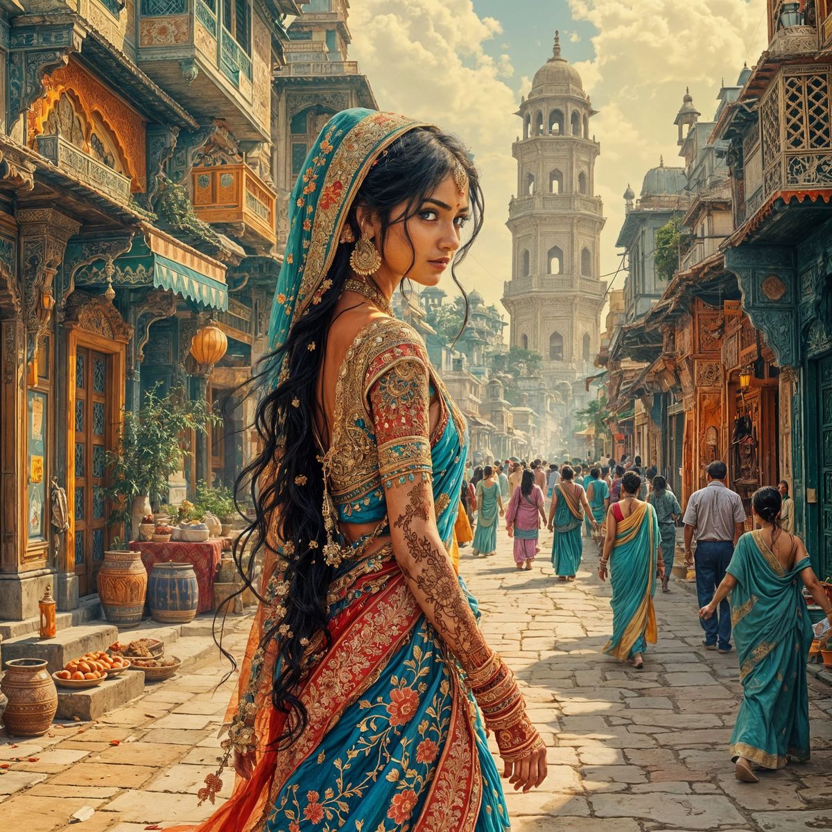 This image shows a beautiful Indian girl with intricate henna tattoos and traditional clothing strolling through a bustling town. The scene is depicted in a realistic and detailed style, evoking a sense of fairytale wonder.
