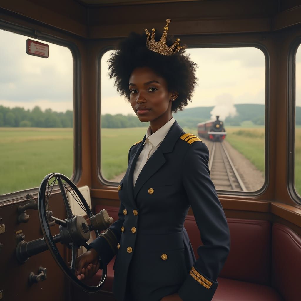 This image shows a strong African American woman with Afro-textured hair, dressed as a conductor, standing confidently on a vintage steam train in the rolling hills and bluegrass fields of rural Kentucky. The dreamy, ethereal atmosphere and regal portraiture style evoke a sense of mystique and wonder.
