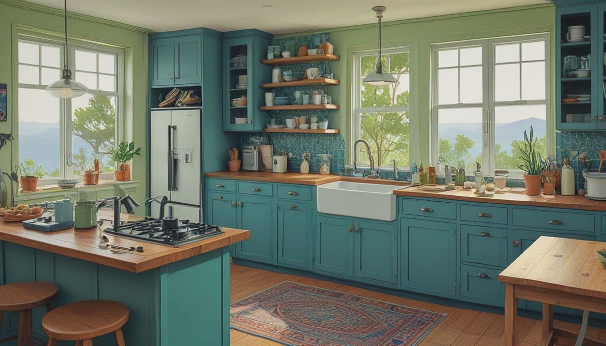 This image showcases a modern kitchen with a sink and stove, rendered in a vibrant comic book style with whimsical details and a pastel color palette.
