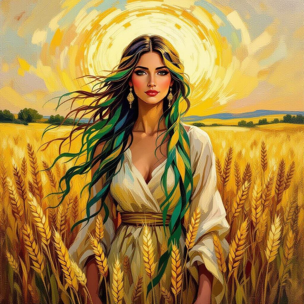 An ethereal goddess of wheat with green and brown hair, adorned in wheat stalks and golden light. This oil painting captures a serene figure in a golden hour wheat field, rendered in a dynamic Neo-Impressionist style with impasto textures.