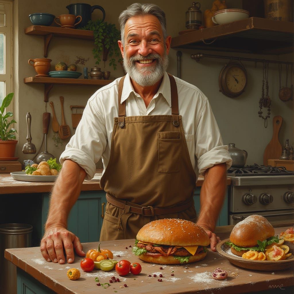 A heartwarming image of a bricklayer radiating joy, framed by cherished family memories and the playful energy of grandchildren, all within the comforting ambiance of a bustling kitchen. The image evokes classical realism.