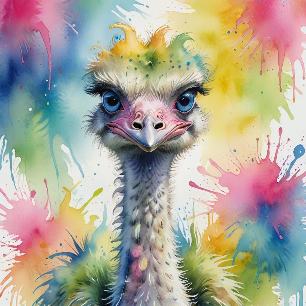 A whimsical watercolor illustration of an ostrich with a vibrant yellow body and large, expressive blue eyes. The ostrich's neck is long and slender, adorned with colorful splashes of pink, green, and blue, creating a lively and playful appearance against a white background. The bird stands confidently, ...