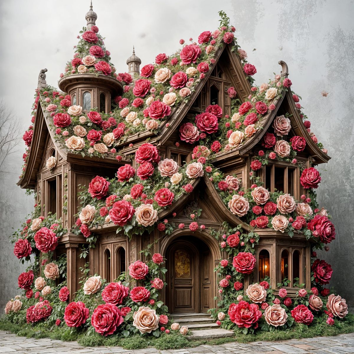This image shows an elaborate building constructed entirely of roses. The architecture features ornate details and a dreamy, enchanted aesthetic.