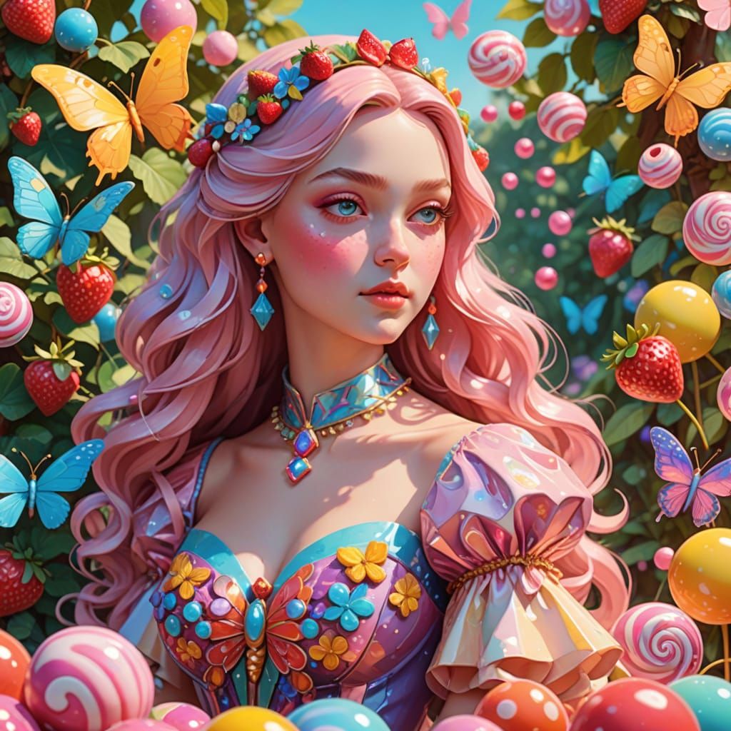 This image is a vibrant, dreamlike depiction of a goddess surrounded by pink strawberry butterflies in a fantastical garden. Created in a style reminiscent of Cezanne's impressionist works, this digital illustration features bold brushstrokes, vivid colors, and sparkling sugar crystals on the goddess's d...