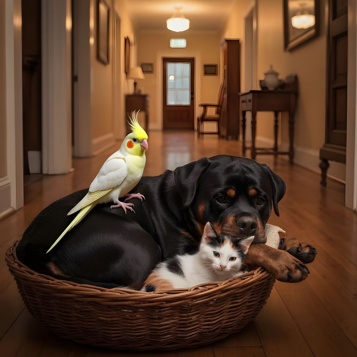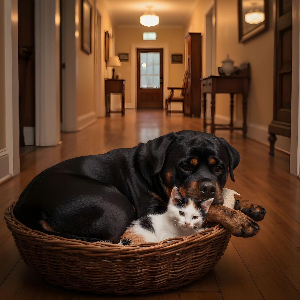 A big Rottweiler curled up an resting in his basket, snuggling and resting with a little kitten, the kitten having white, black and orange fur. The rottweiler is having one paw draped around the kitty. The background is the hallway of a farmhouse in the evening, the mood of the image being cute and peaceful. ...