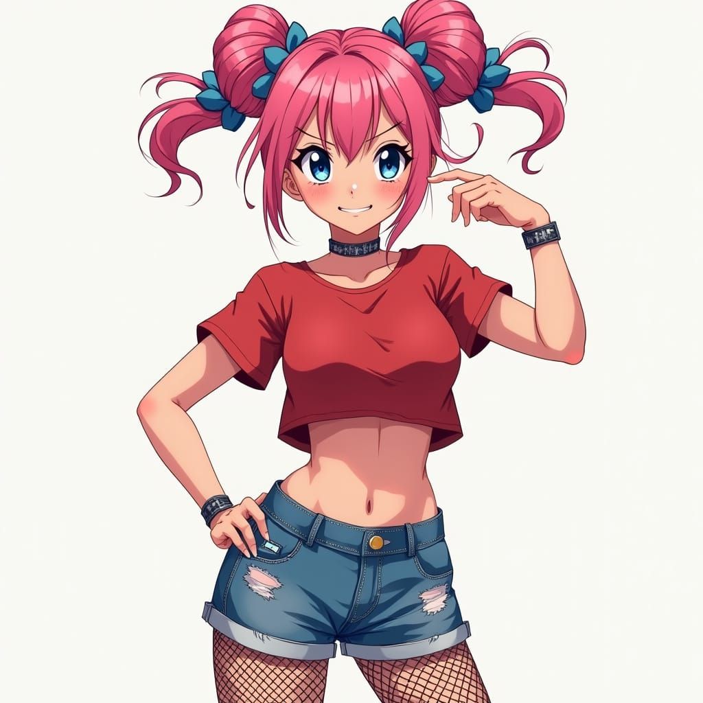 A digital anime-style portrait of a young woman with pink and blue hair in twin buns, wearing a crop top, shorts and net tights. She has piercing blue eyes and a confident smirk.