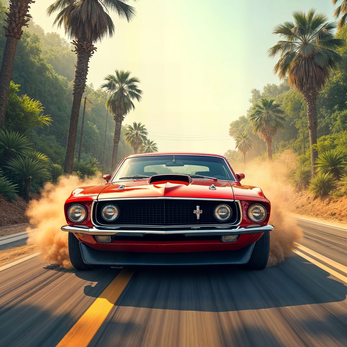 A hyperrealistic image of a red Ford Mustang Boss 429 speeding down a desert road with jungle foliage. Cinematic lighting and dynamic composition create a vibrant and detailed scene.