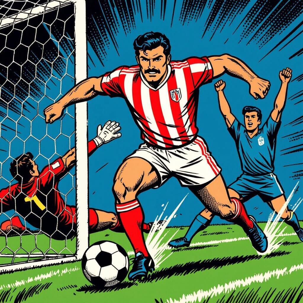 This image shows a retro comic book illustration of a footballer scoring a goal, featuring dynamic linework, bold outlines, and vibrant halftone shading.
