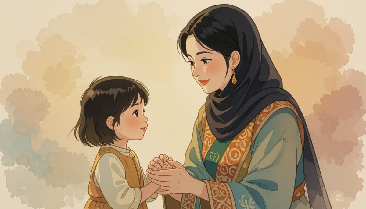 This image shows an Indonesian mother holding her child's hand, set against a warm pastel background. The style evokes a watercolor painting with soft, delicate textures.