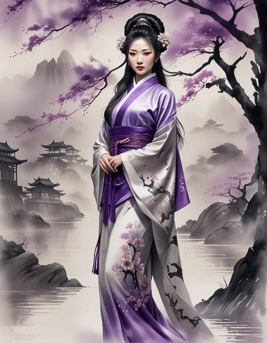 A striking picture of a Korean goddess kitsune in traditional sumi-e style. The image features delicate ink strokes, vibrant purple clothing, and soft film grain lighting, reminiscent of traditional Chinese art.