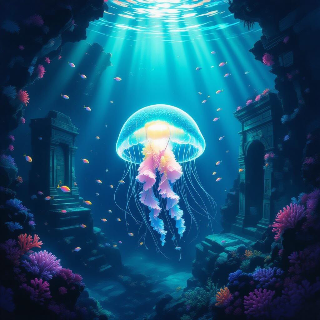 This image shows a bioluminescent jellyfish drifting through a deep-sea trench. It illuminates ancient ruins covered in glowing coral, while schools of fish dart around it in the watercolor style.