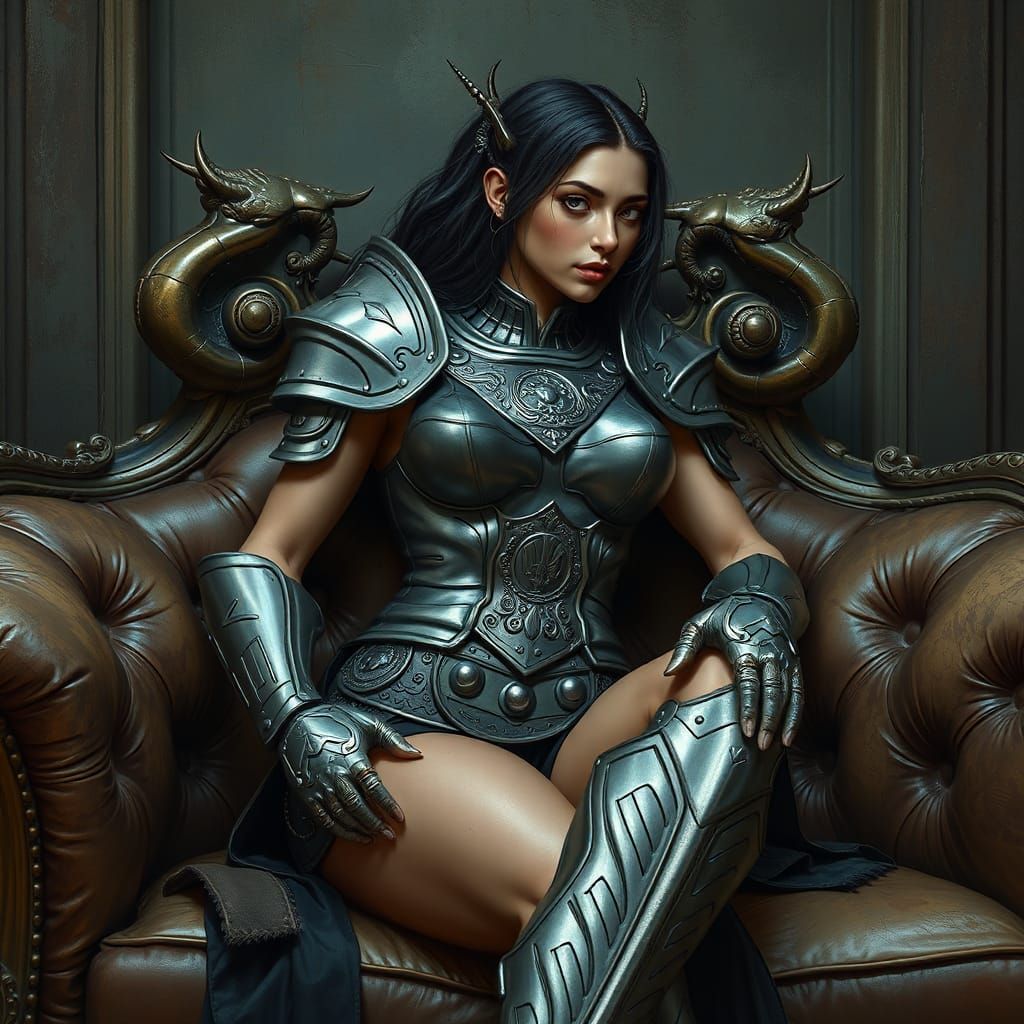A striking picture of a towering, muscular woman in ornate medieval armor reclining on a plush sofa. This digital artwork features hyper-realistic details, metallic textures, and deep shadows.