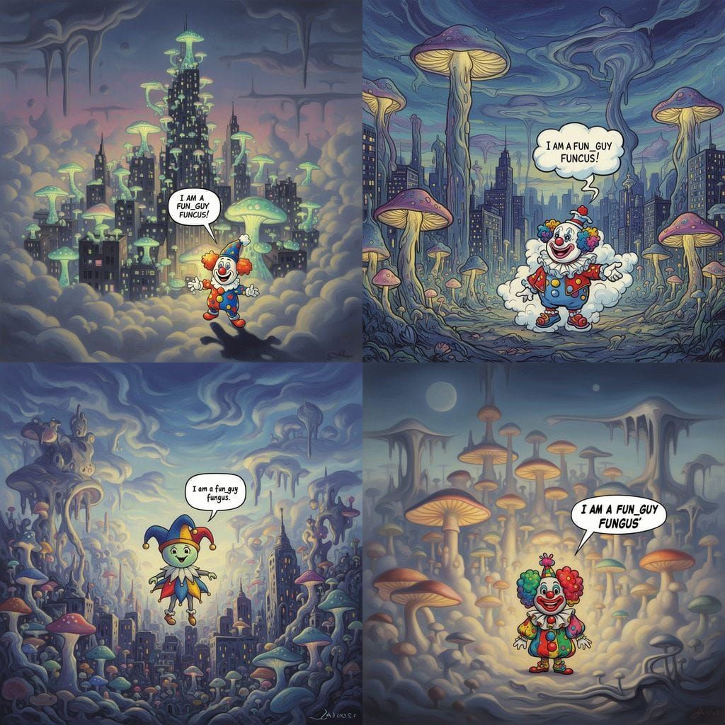 Make a comic style glowing fungi city with a sumptuous small fungus n happy clown costume and saying I am a fun_guy fungus in pillowy cloud...