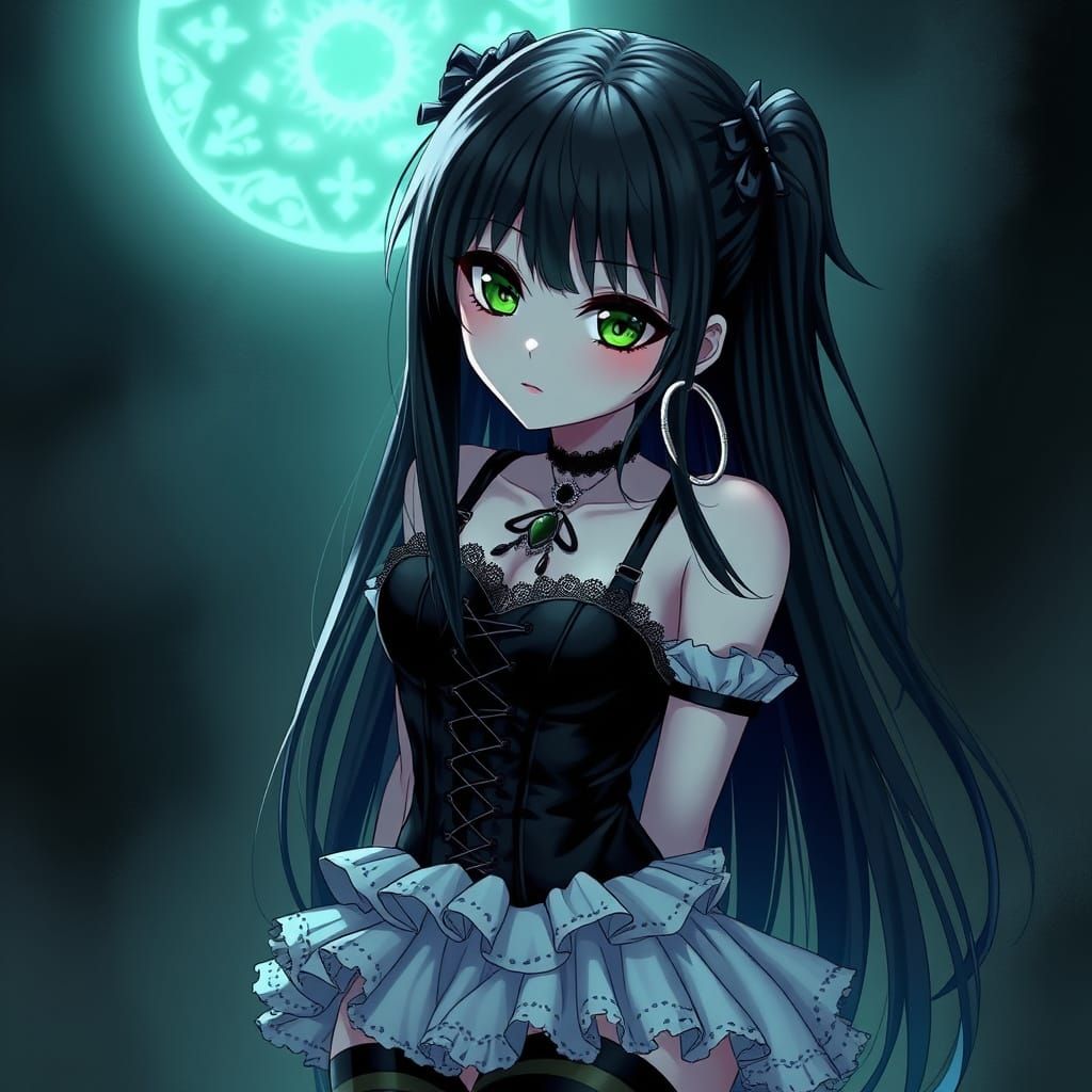 A digital illustration of a gothic anime girl with green eyes and long black hair. She wears a black corset, mini skirt, and striped tights in a manga-inspired style, with neon accents.