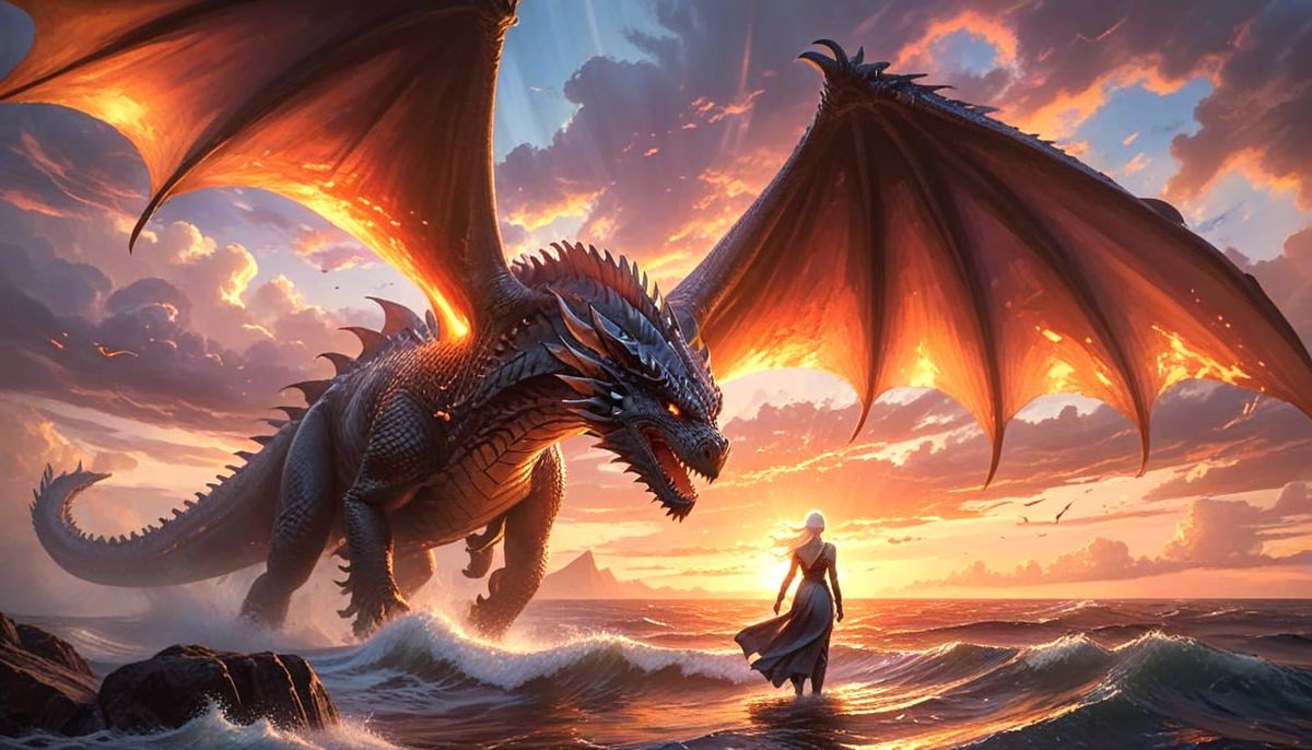 This breathtaking image captures the Mother of Dragons and her dragon companion in a moment of serene harmony, soaring above the ocean as the sun sets in a kaleidoscope of orange and pink hues, with the dragon's shimmering silver scales standing out against the vibrant sky.