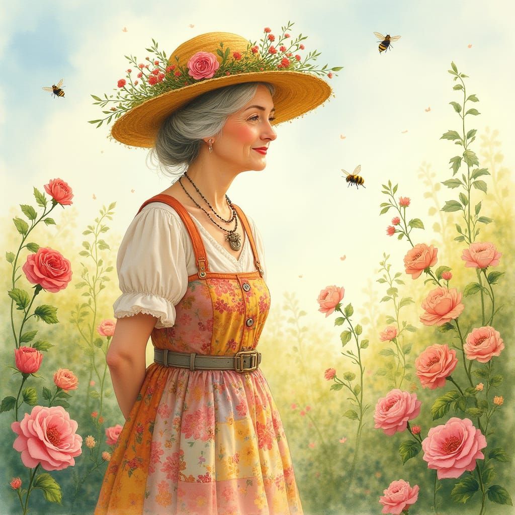 A delightful image of an elderly woman in a vibrant patchwork dress and floral hat, standing in a sun-drenched garden. The artwork has a whimsical watercolor style.
