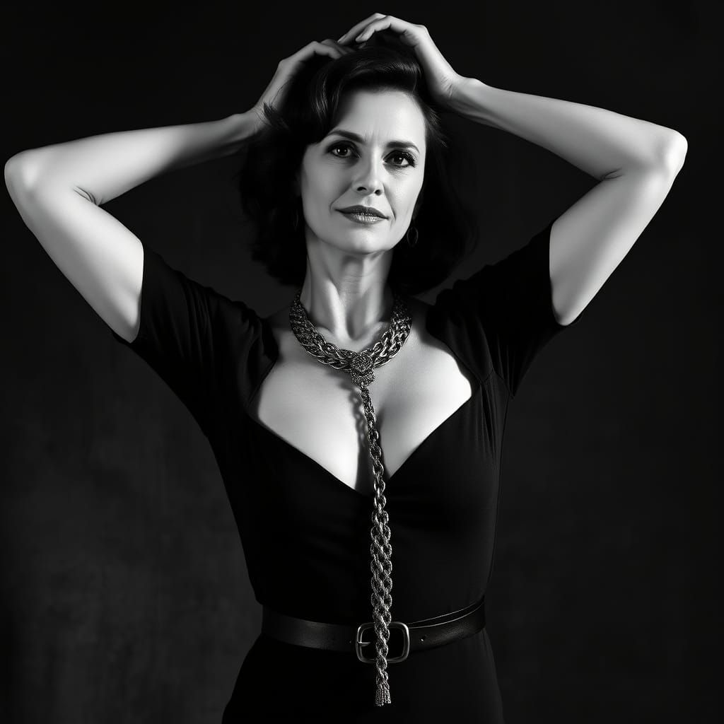 A sophisticated woman poses confidently in a classic black and white aesthetic, inspired by Old Hollywood glamour and vintage photography, with a metallic necklace and elegant form set against a dark gray background.
