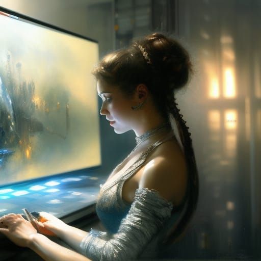 Portrait of a pretty female humanoid robot lab assistant working at the modern computer lab on a spacecraft, big screens. Luis Royo style detailed drawing. masterpiece. intensely detailed. sharp. f22
