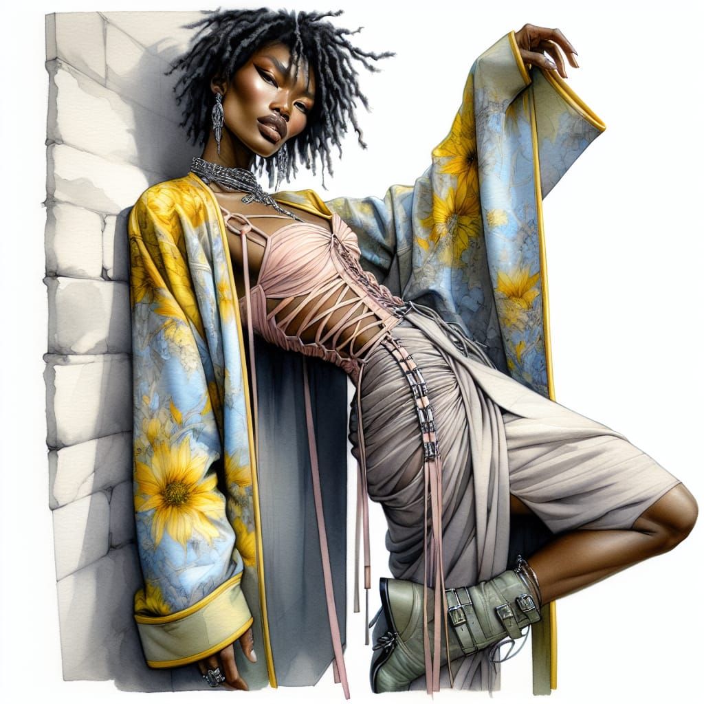This image shows a stylish Afro-Asian woman in an elegant pose. She leans against a wall, her gaze direct. Dressed in Asian-inspired fashion with modern twists and silver jewelry, rendered as digital watercolor art.