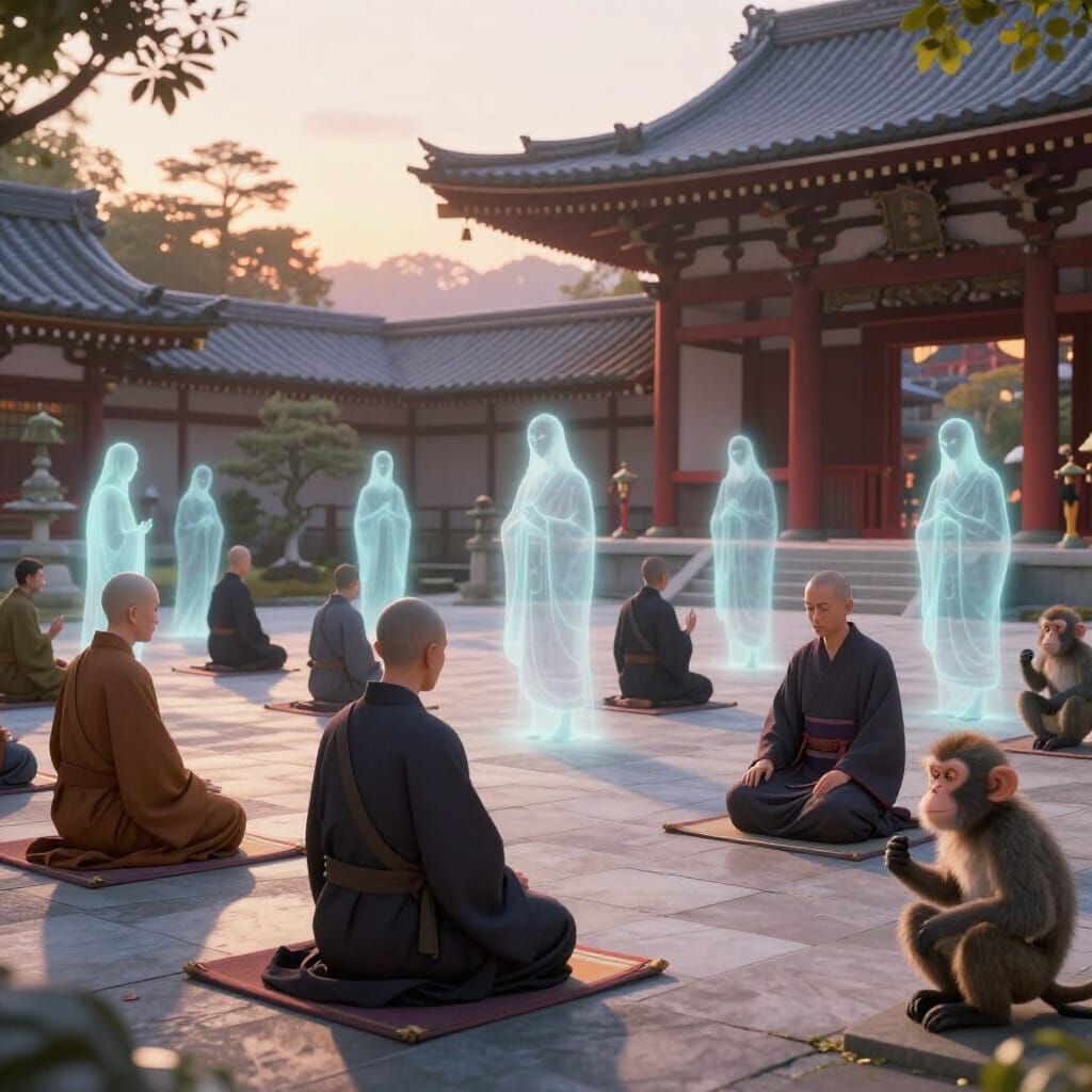 This 3D anime art depicts a tranquil Japanese temple courtyard at dawn, featuring robed monks, spectral ghosts, and playful monkeys in prayer. The scene uses hyperrealistic textures and fine detail for a spiritual awakening atmosphere.