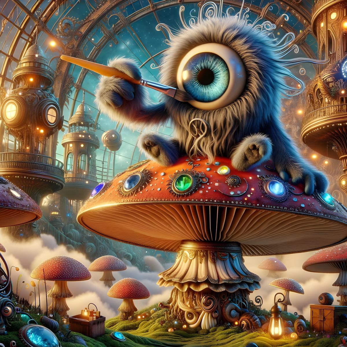 A whimsical monster resembling a hairy eyeball paints a mushroom in a steampunk world. The digital art features cel-shaded aesthetics, hyperreal colors, and details inspired by animated fantasy.