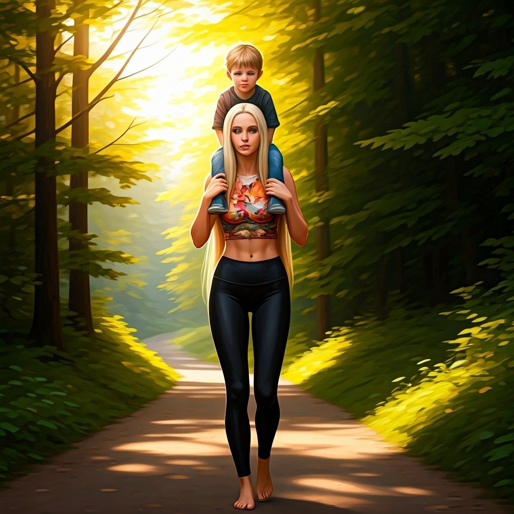 This image depicts a tall, beautiful blonde woman carrying a boy on her shoulders through a forest path. Rendered in a painterly fantasy concept art style with warm, golden hour lighting.