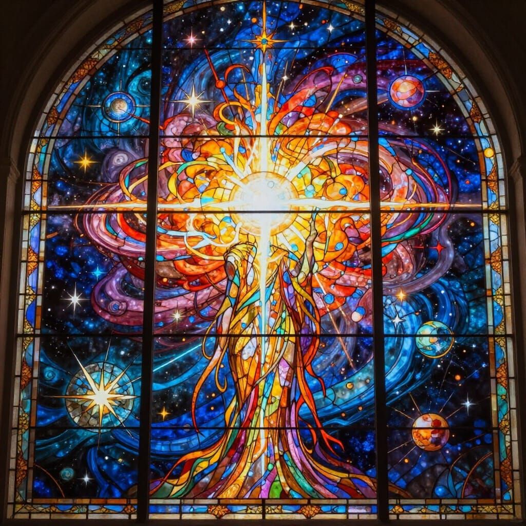 This image shows a cosmic entity, depicted as a detailed stained glass window, creating a new planet amidst swirling nebulae and stars. It features jewel tones and dramatic light diffusion.
