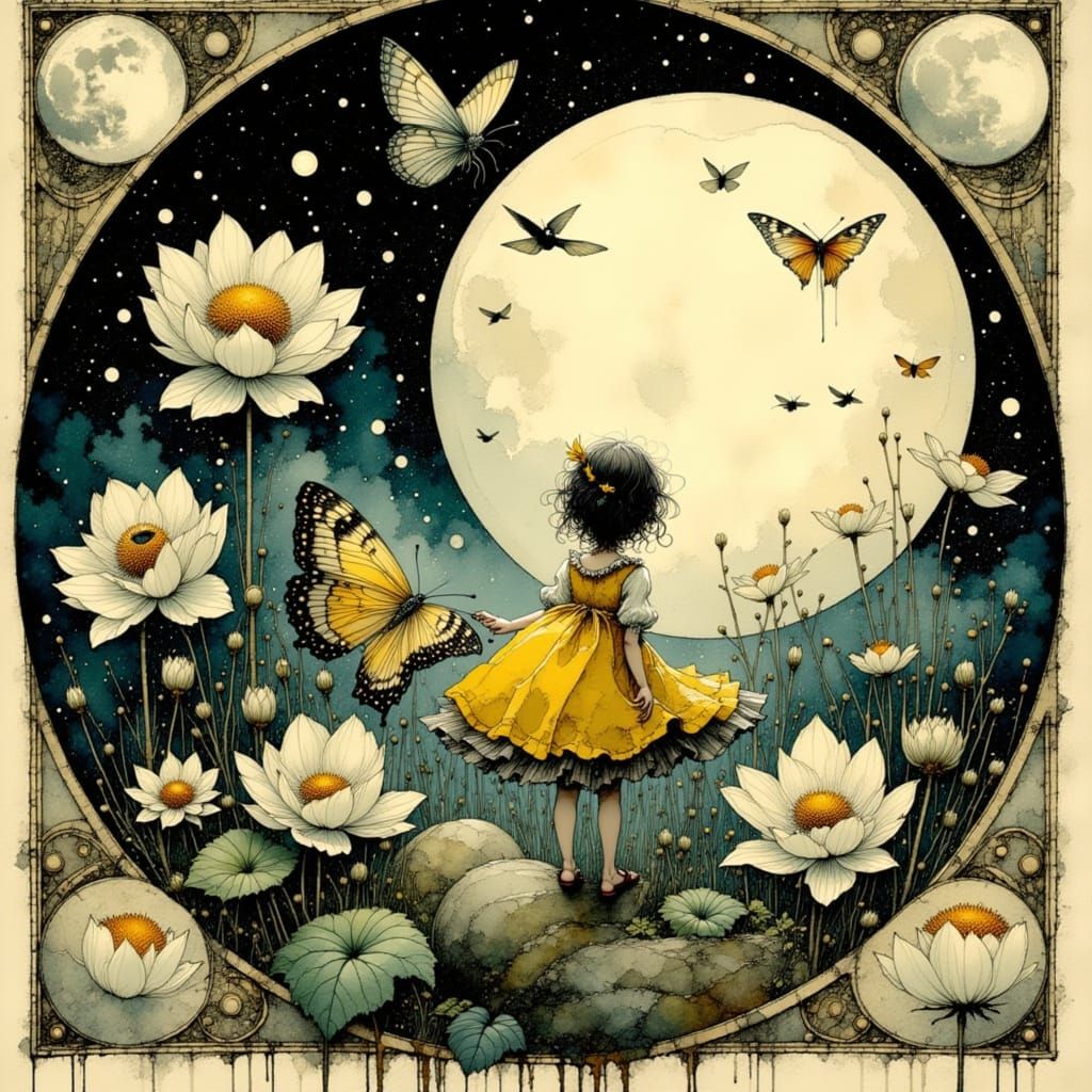 A vintage-styled illustration of lunar moths dancing among glowing flowers beneath a moonlit sky. The image, with phases of the moon in the border, evokes a dreamy and intricate fairy-tale aesthetic.