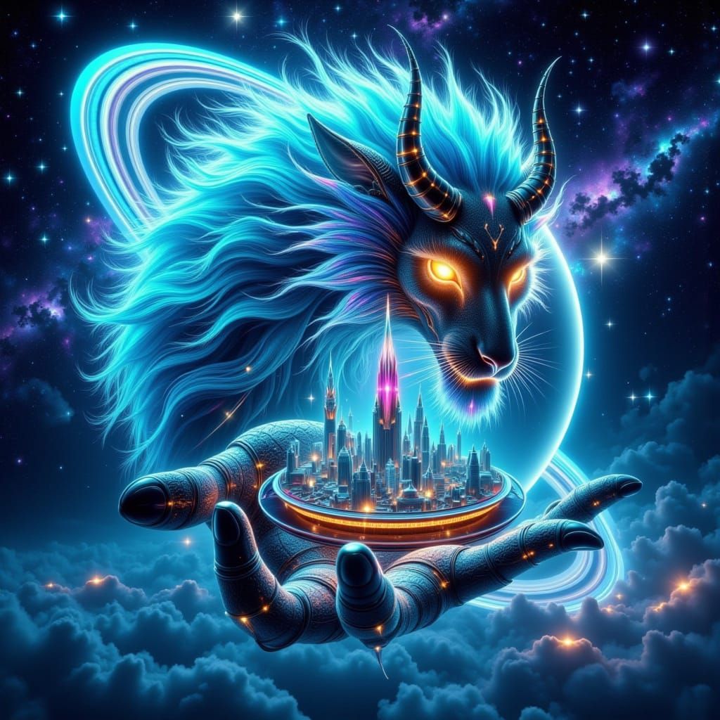 This stunning image captures a majestic gas giant planet with icy blue rings, evoking the grandeur of Saturn, amidst a kaleidoscope of cosmic colors and a steampunk-inspired entity with glowing eyes and intricate armor plating.