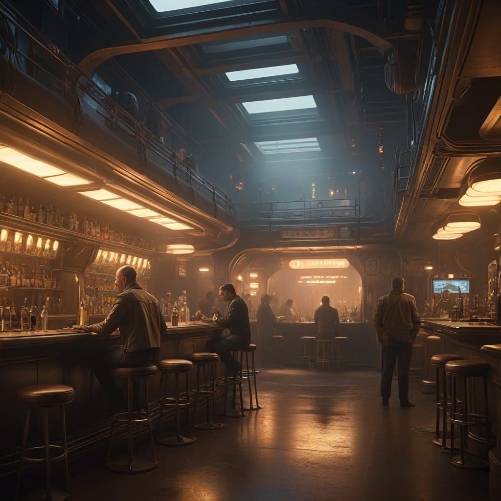 A crowded, smoky cantina filled with alien patrons, a lone figure sits at the bar. Hazy smoke and neon lights create a warm, golden atmosphere, inspired by science fiction and retro-futuristic aesthetics.