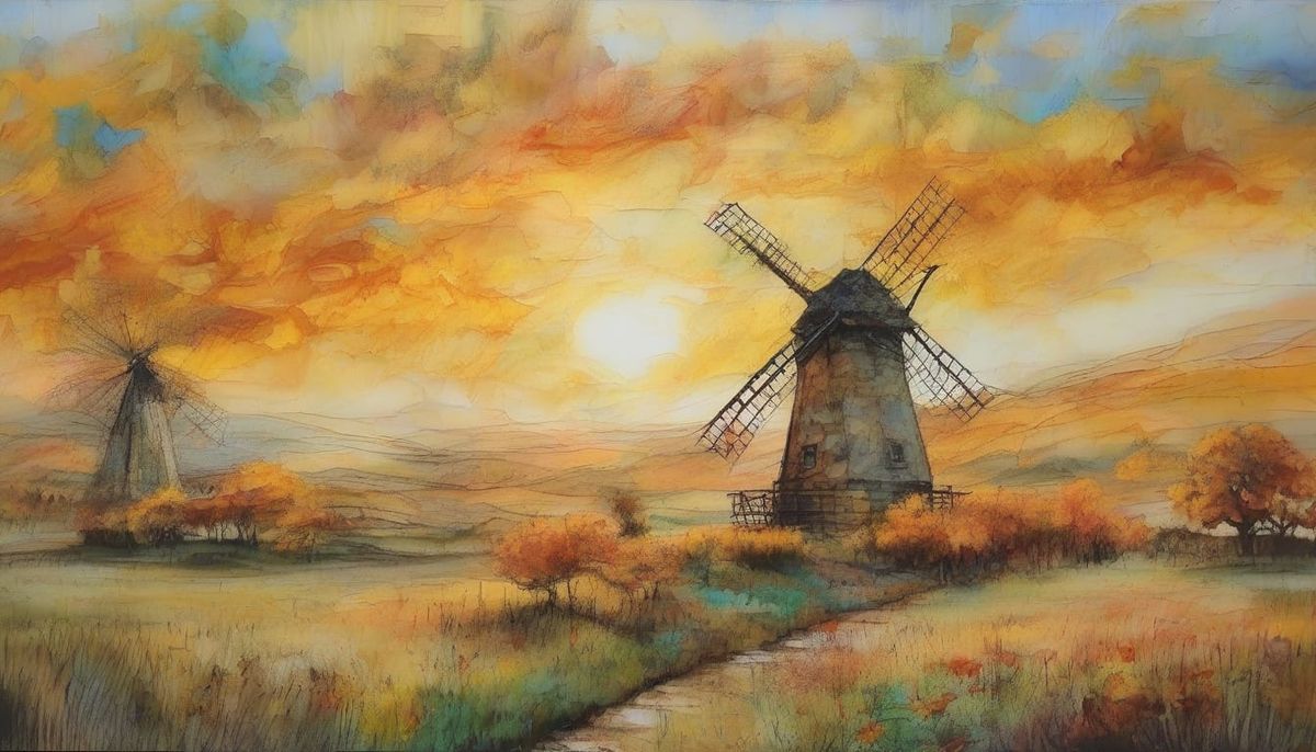 This image depicts a dreamy spring landscape with a chaotic sunset and a whimsical windmill, blending encaustic and alcohol ink techniques in a unique fusion of artistic styles.