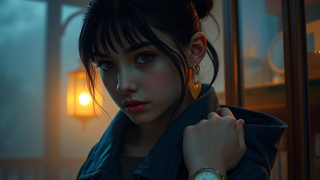 This image captures a teenage girl, Eliza, stepping into a warm, golden-lit room, her silhouette dissolving from the foggy exterior. The scene is characterized by intricate textures, atmospheric lighting, and an ultra-realistic aesthetic, evoking a sense of wonder and enchantment.