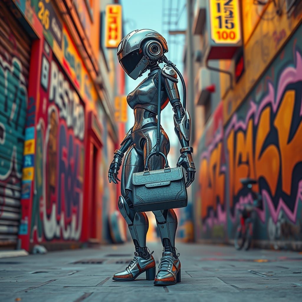 A vivid street scene featuring a female robot with a unique handbag, set against graffiti art in a bluesy ambiance. The artwork blends splash art and street art with futuristic aesthetics.