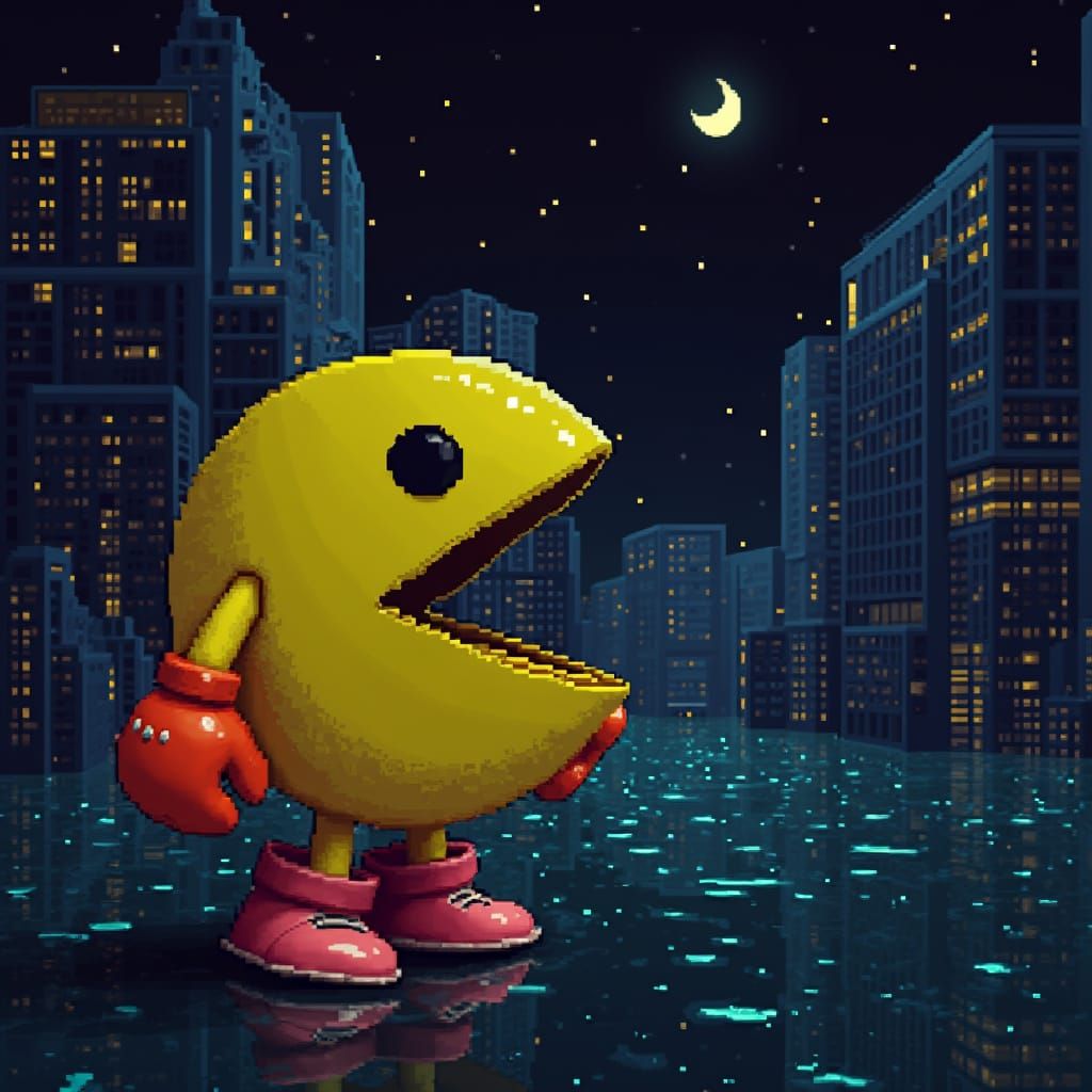 This image is a cinematic film still of Pac-Man in a live-action 8-bit world, shot on 35mm film with dramatic lighting and heavy film grain, in a unique blend of retro and cinematic styles.