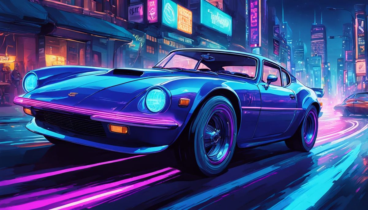 A vibrant image shows a blue sports car speeding through a neon city at night. This retro-futuristic comic book art features dynamic neon colors and cinematic lighting.