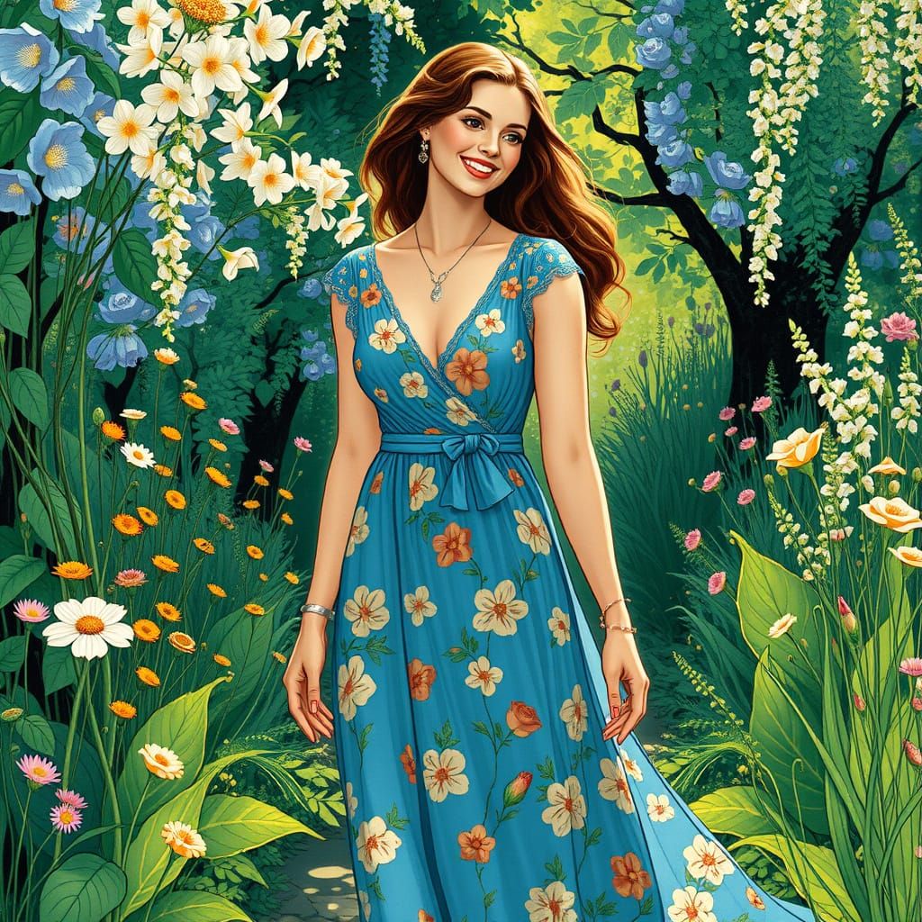 This image depicts a charming, light-blue floral print dress, reminiscent of Alphonse Mucha's style, with soft lines and pastel colors, as a woman strolls through a lush garden, surrounded by wildflowers and verdant foliage, evoking a sense of whimsy and freedom.