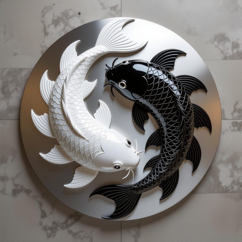 This image shows two intertwined koi fish forming a yin and yang symbol. The sculpture is crafted from polished metal in a biomechanical, industrial style.