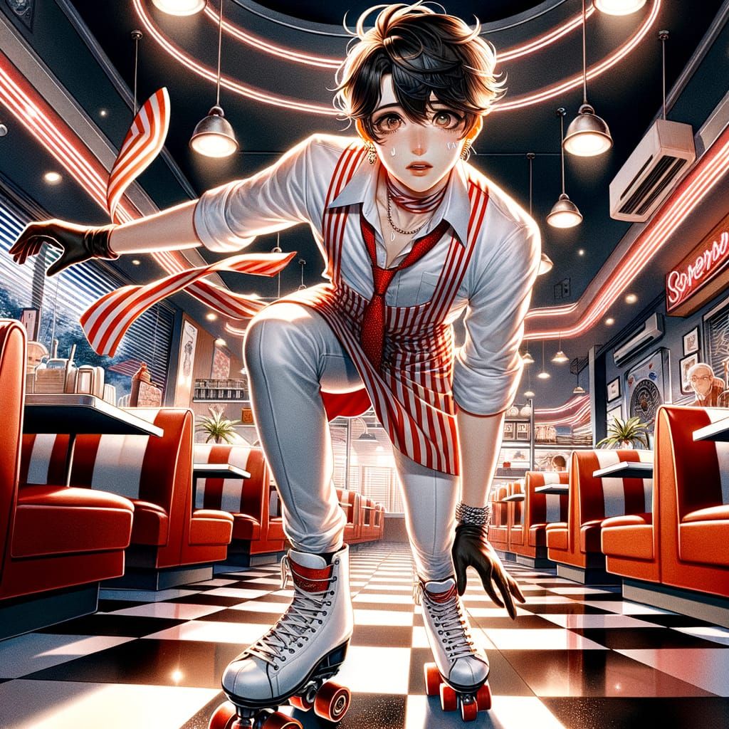 This image shows an anime-style waiter in a retro diner, styled as a Japanese woodblock print. The scene captures a moment of comical panic in a vibrant, 1950s-themed setting.
