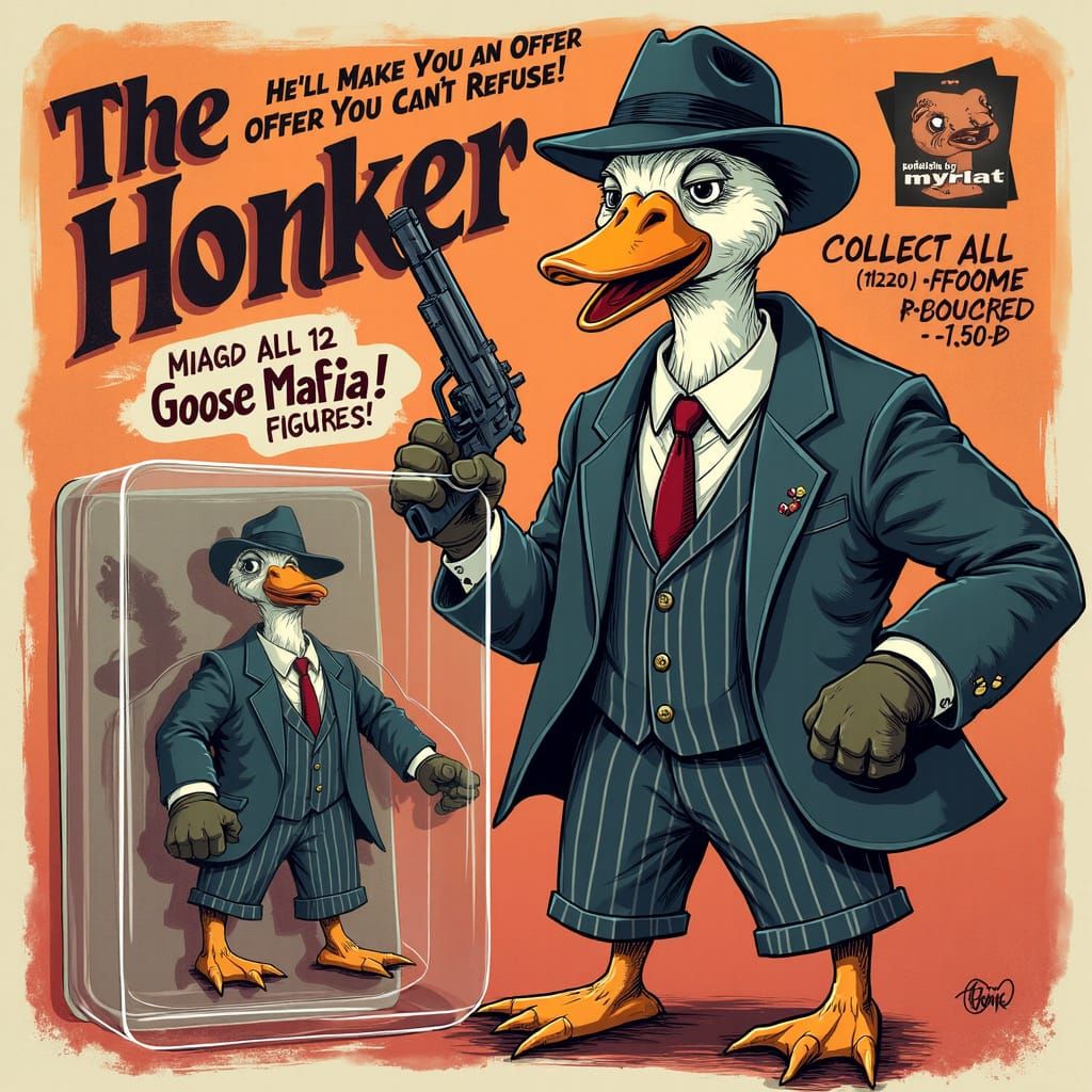 This image features a comical anthropomorphic goose in a mafia outfit, complete with a fedora and tommy gun, in a colorful plastic blister pack with humorous taglines, reminiscent of 1980s and 1990s comic book art.
