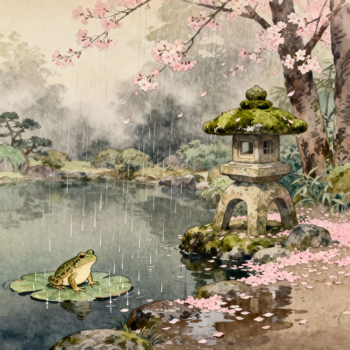 This image depicts a serene Japanese garden with a stone lantern and frog on a lily pad during a soft rain. Inspired by Ukiyo-e and watercolor styles, it features falling cherry blossoms and diffused light.
