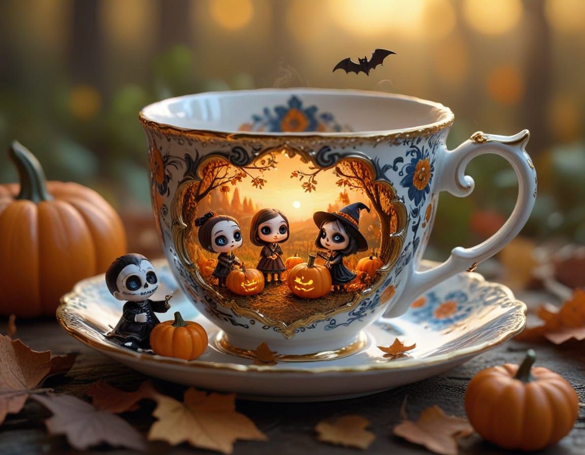 This image shows a miniature Dia de Muertos pumpkin harvest celebration inside a broken teacup. Features chibi characters in a fantasy scene with golden hour lighting.