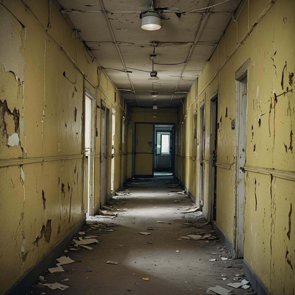 This image shows a derelict corridor with peeling paint and flickering lights. The digital photograph features high dynamic range, warm muted colors, sharp details, and a cinematic, mysterious ambiance.