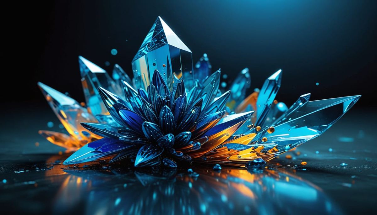Crie uma imagem de tirar o fôlego que interpreta a física quântica por meio da arte, Uma arte digital, com formas abstratas que lembram vidr...